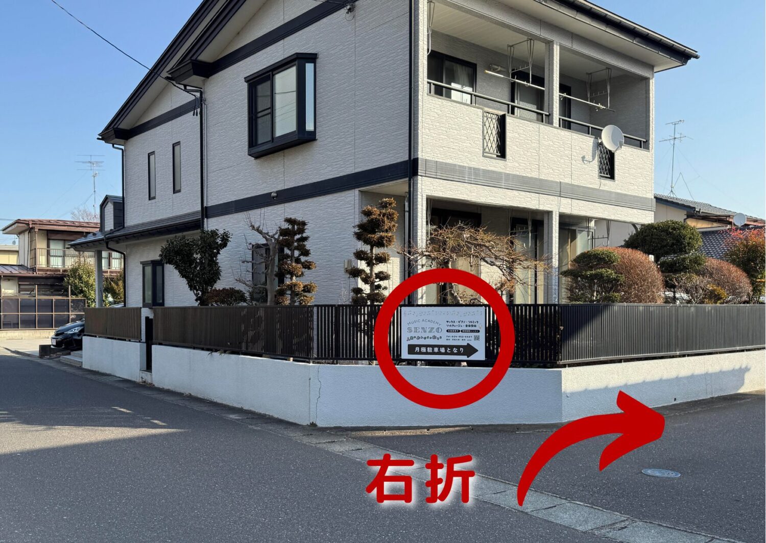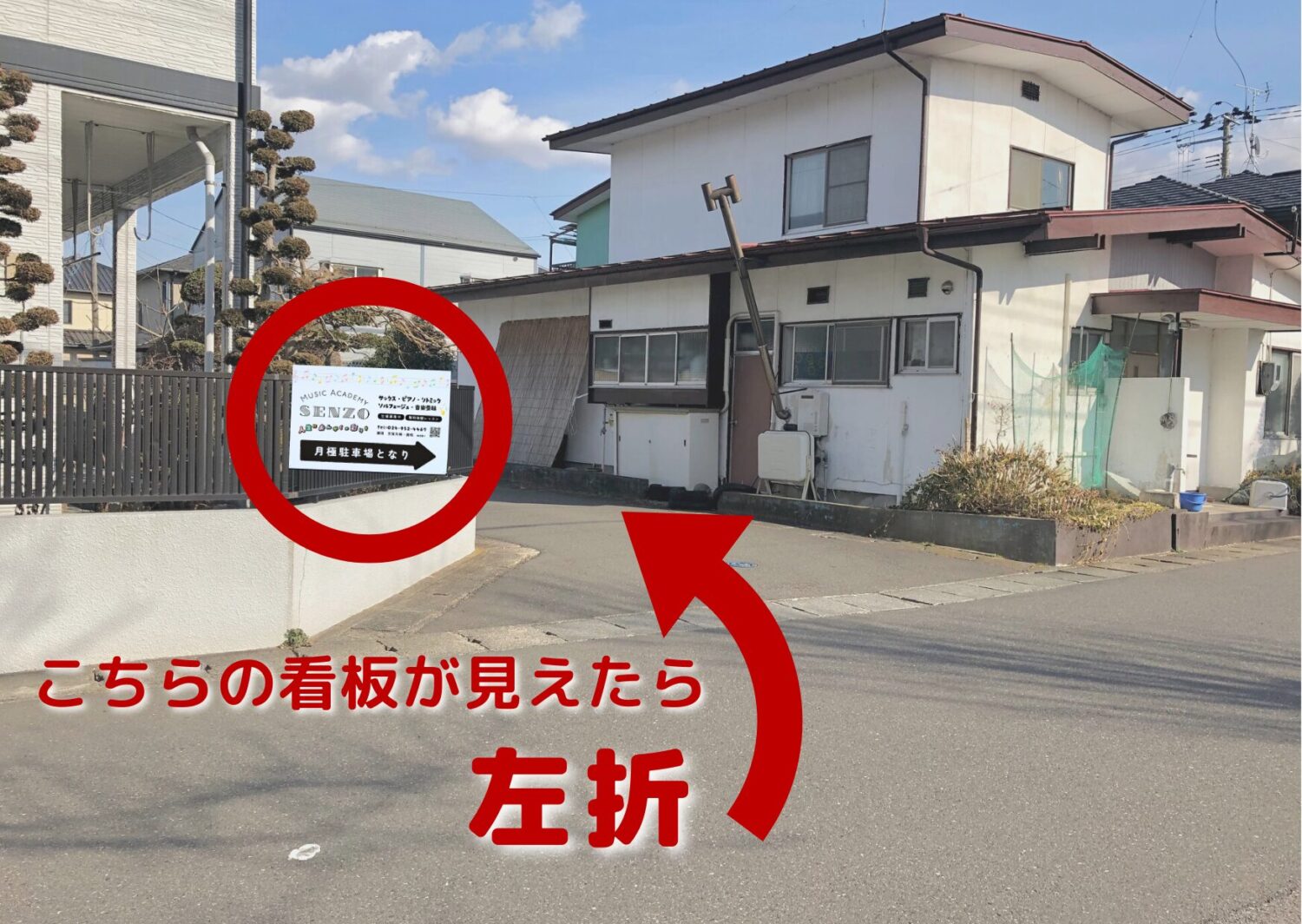 左に「月極駐車場」と「Music Academy SENZO」の看板が見えてくるので、