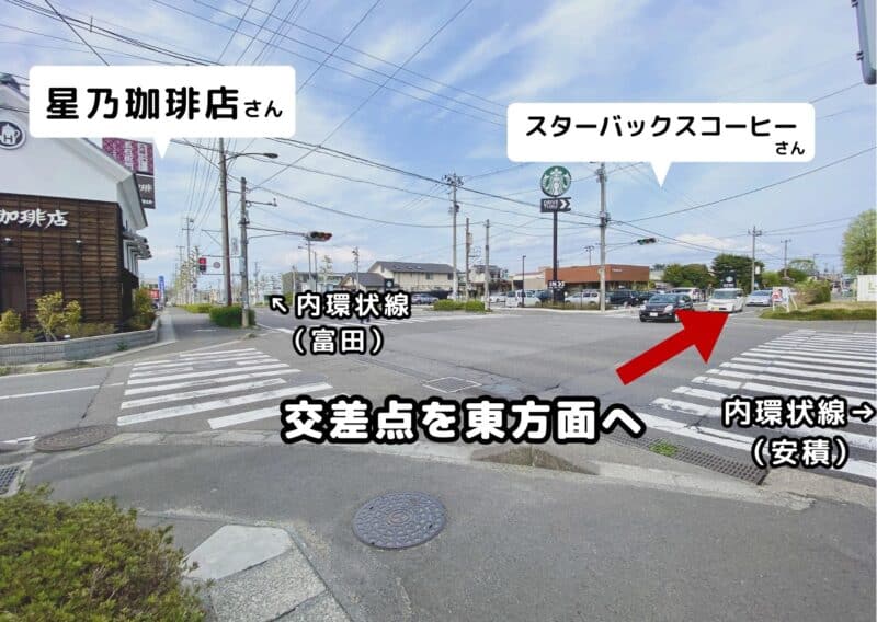 (スターバックスコーヒーさんと星乃珈琲店さんのある交差点を東方面へ)