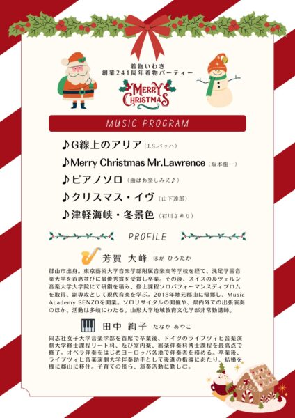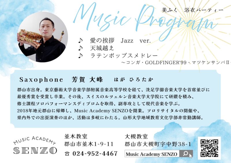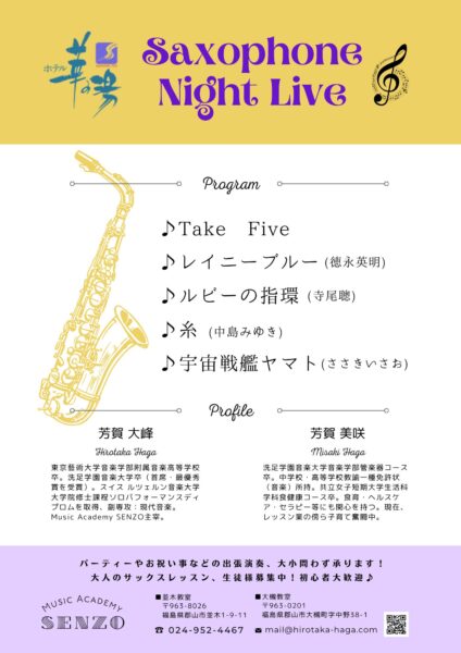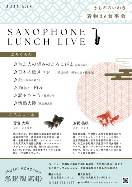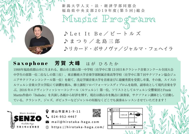 石巻グランドホテル/MC込みで60分/約60名/サックス×2(芳賀大峰・芳賀美咲)または、ピアノ(芳賀大峰)&サックス(芳賀美咲)