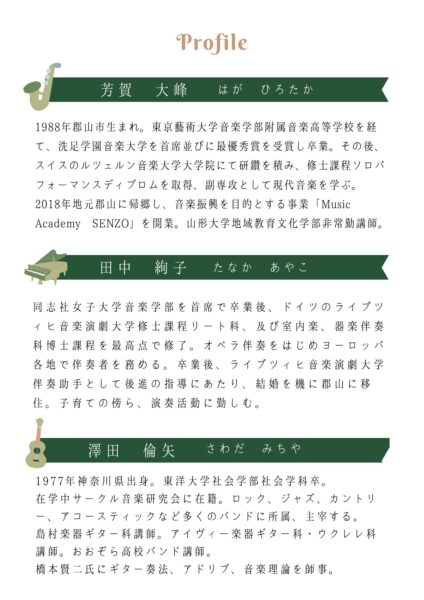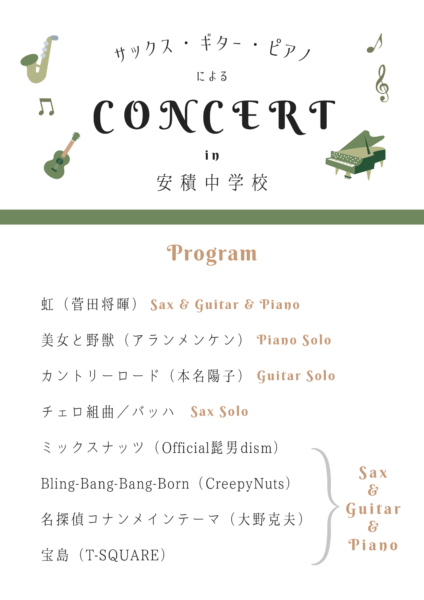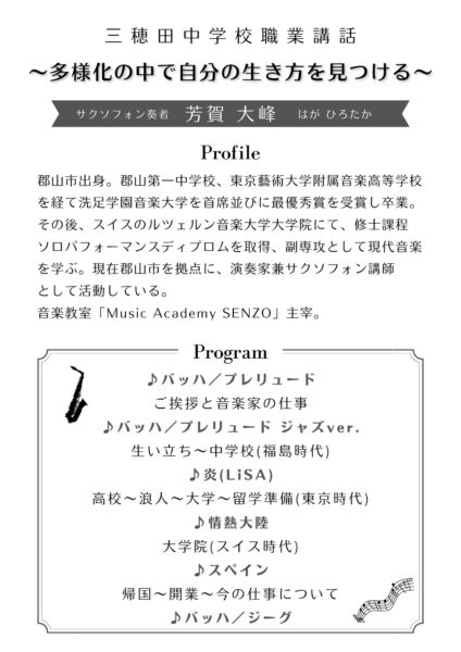 安積中学校体育館/MC込みで60分/約360名/サックス(芳賀大峰)・ピアノ(田中絢子)・ギター(澤田倫矢)
